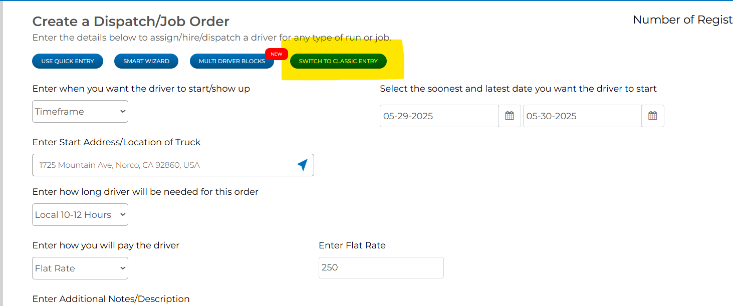 When you need a driver to complete a shift for a set amount of time and you do not know the exact stops beforehand, you can do the following: 1) Enter the date and time that you would like the driver to arrive at your truck. 2) Enter the start ...