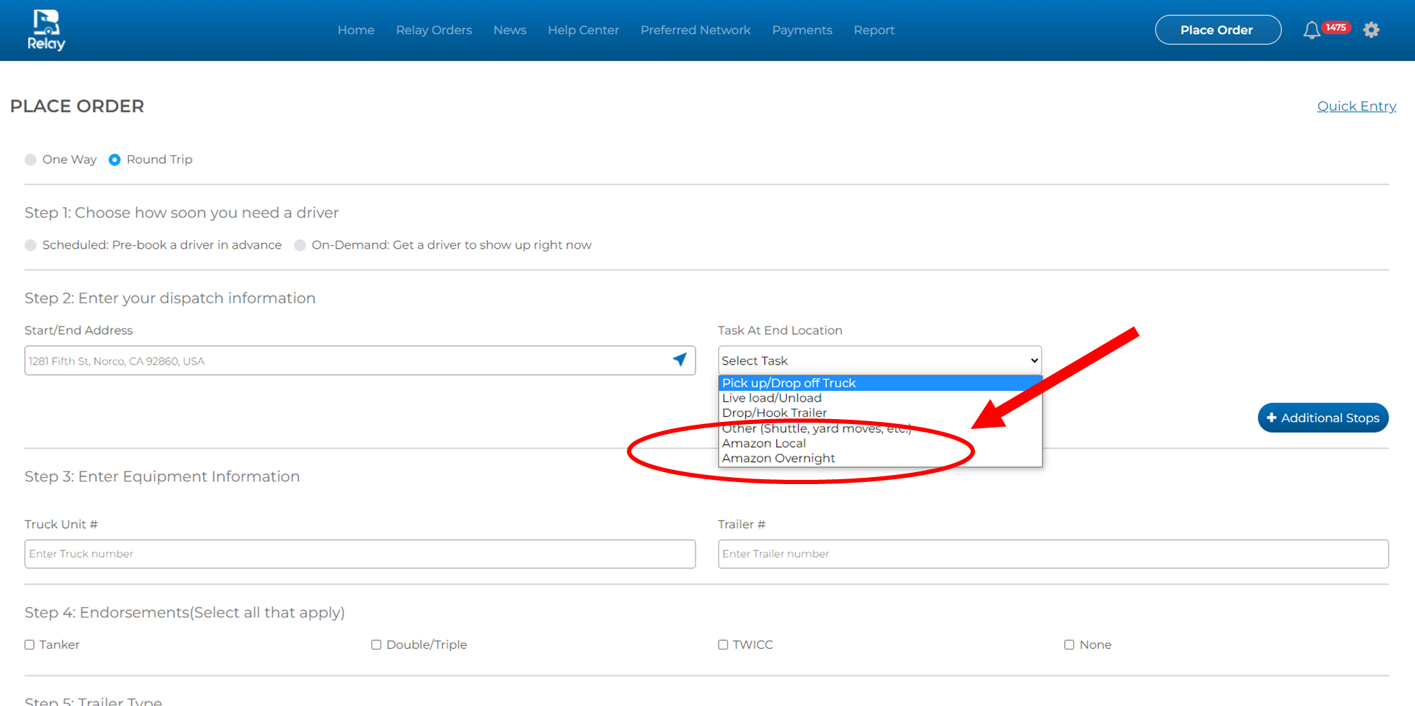 When you need a driver to complete a trip for you that you already know the trip details for, you can do the following: 1) For the 'Start/End Address', enter where your truck is located (AKA your yard) 2) For the 'Task at End Location', select 'Pick ...
