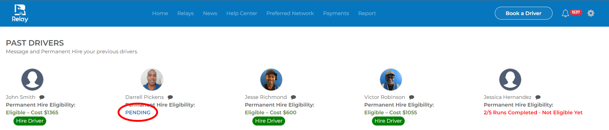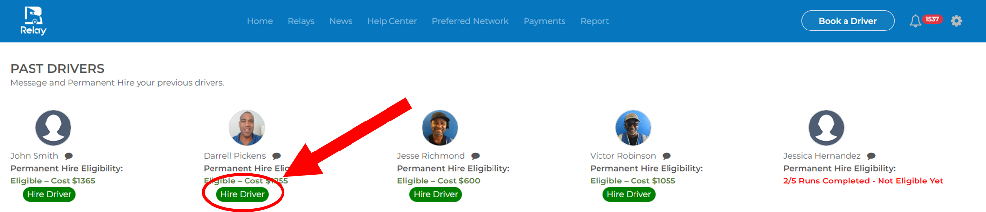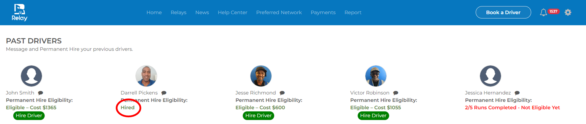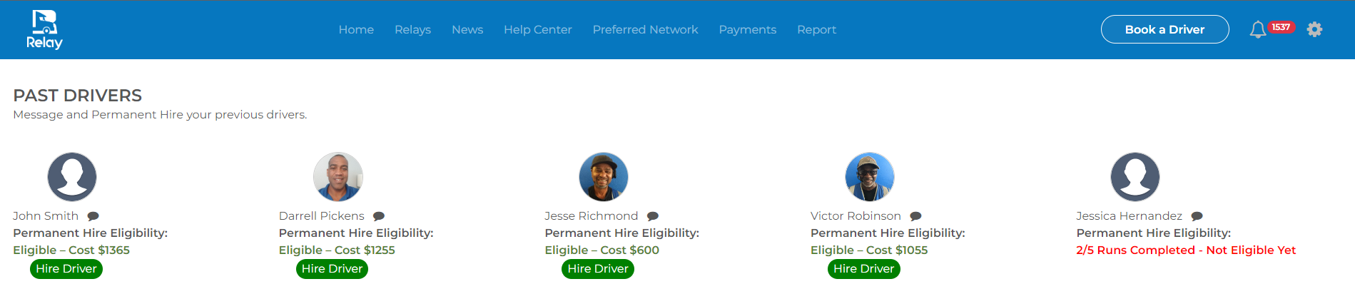 2) You'll now see all of the Relay drivers you've worked with and their eligibility for direct hire.