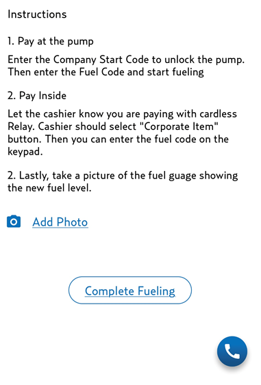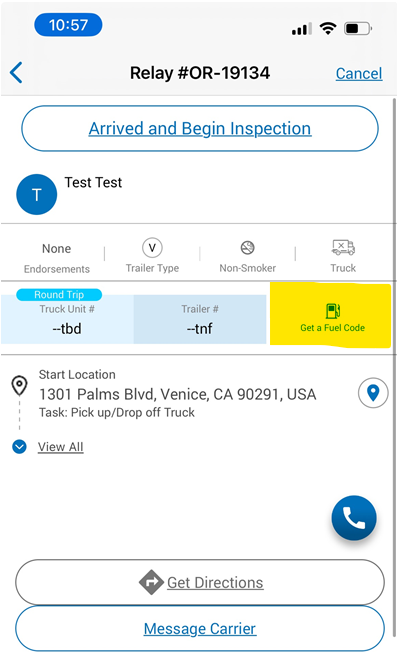 On the Relay app, the driver will click into the current order and select the "Get a Fuel Code" button.