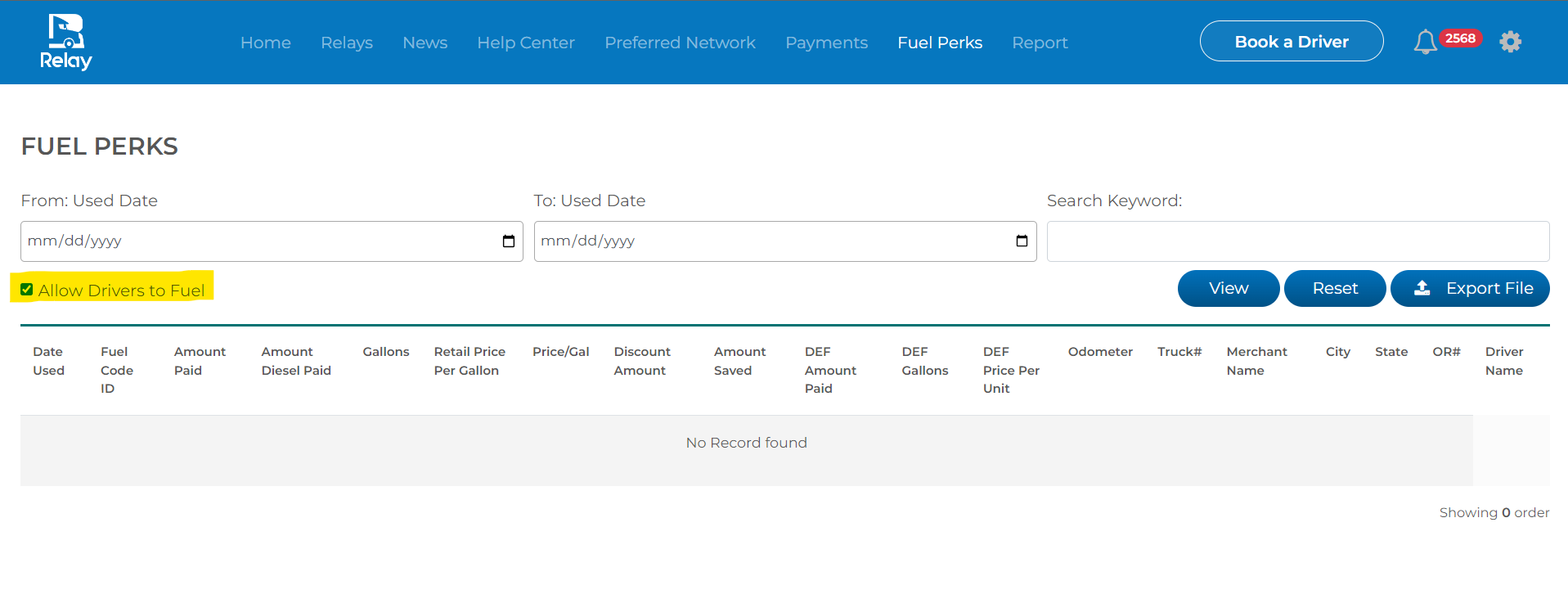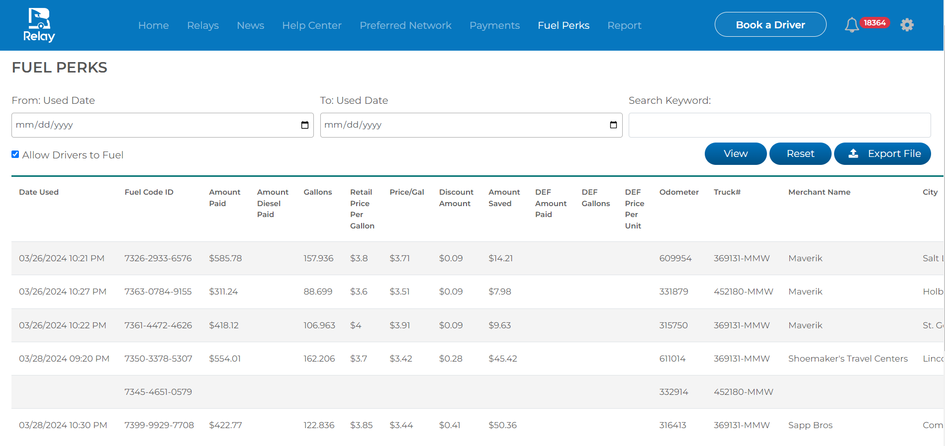 To see all of your past fuel code transactions, you can login to your desktop portal from a computer and click the Fuel Perks option on the top menu. From here you'll be able to see an overview of fuel codes that were used by drivers on your orders. You'll be able to quickly see information like amount spent, Relay order number, date used, city and location, and multiple other important data points.