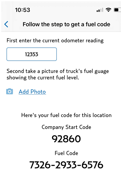 After that, they will have to enter the truck's current odometer and upload a picture of the odometer. After doing this, the app will automatically locate the fueling location with the highest available discount, issue a valid fuel code and give the driver the address for that location. If there is not a fueling location available within the given search radius, the app will give the driver the closest 3 available addresses and will only issue a fuel code once the driver is closer to a valid fueling location.