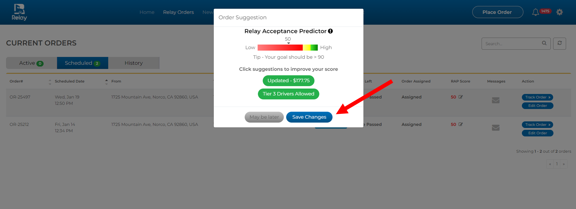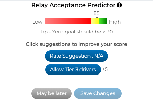 When using the RAP Score (Relay Acceptance Predictor) correctly, about 98% of all runs get accepted. If your dispatch does not get accepted by the scheduled start time, we recommend the following: 1) Reschedule your order to the next day or whatever ...